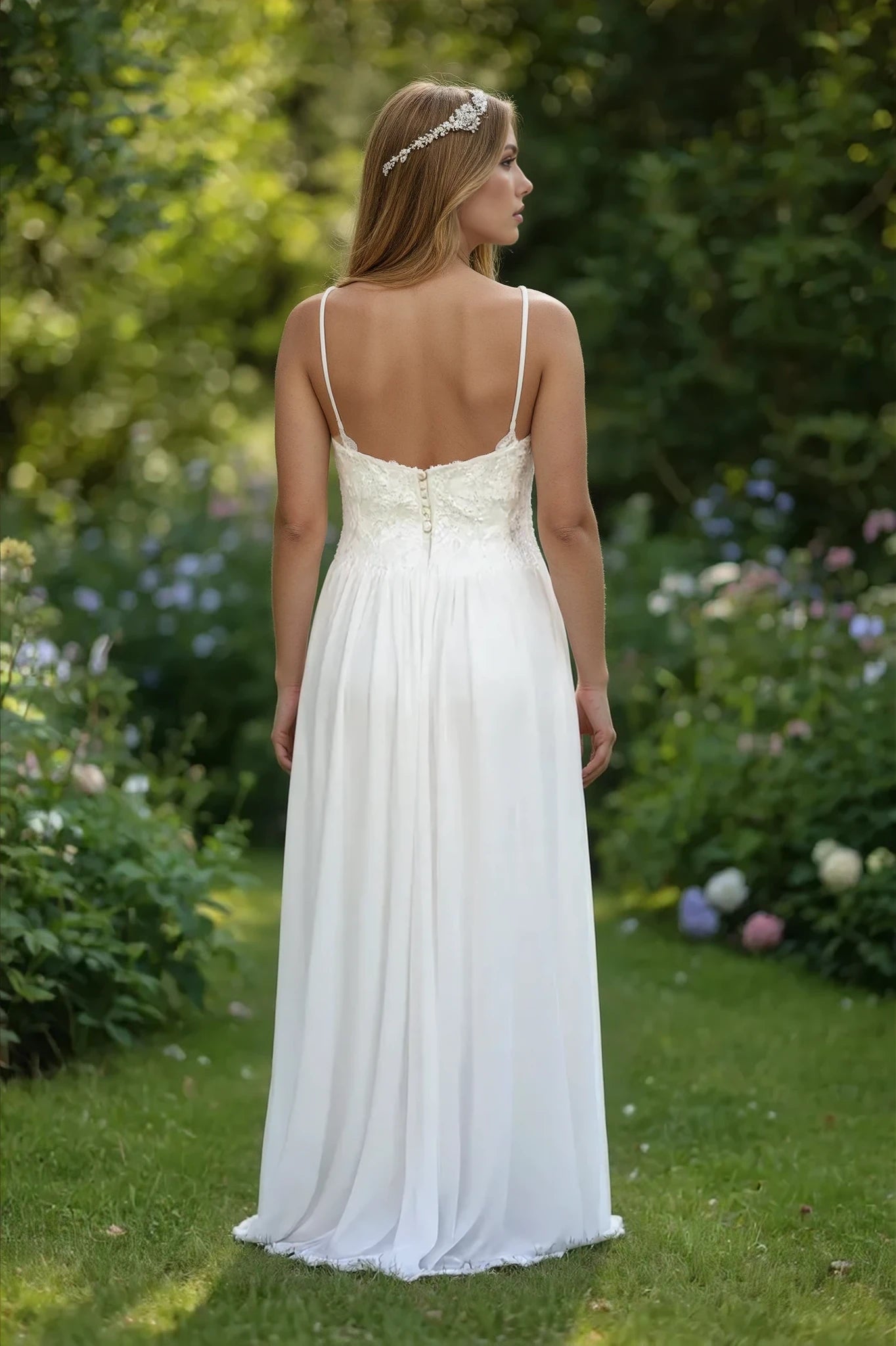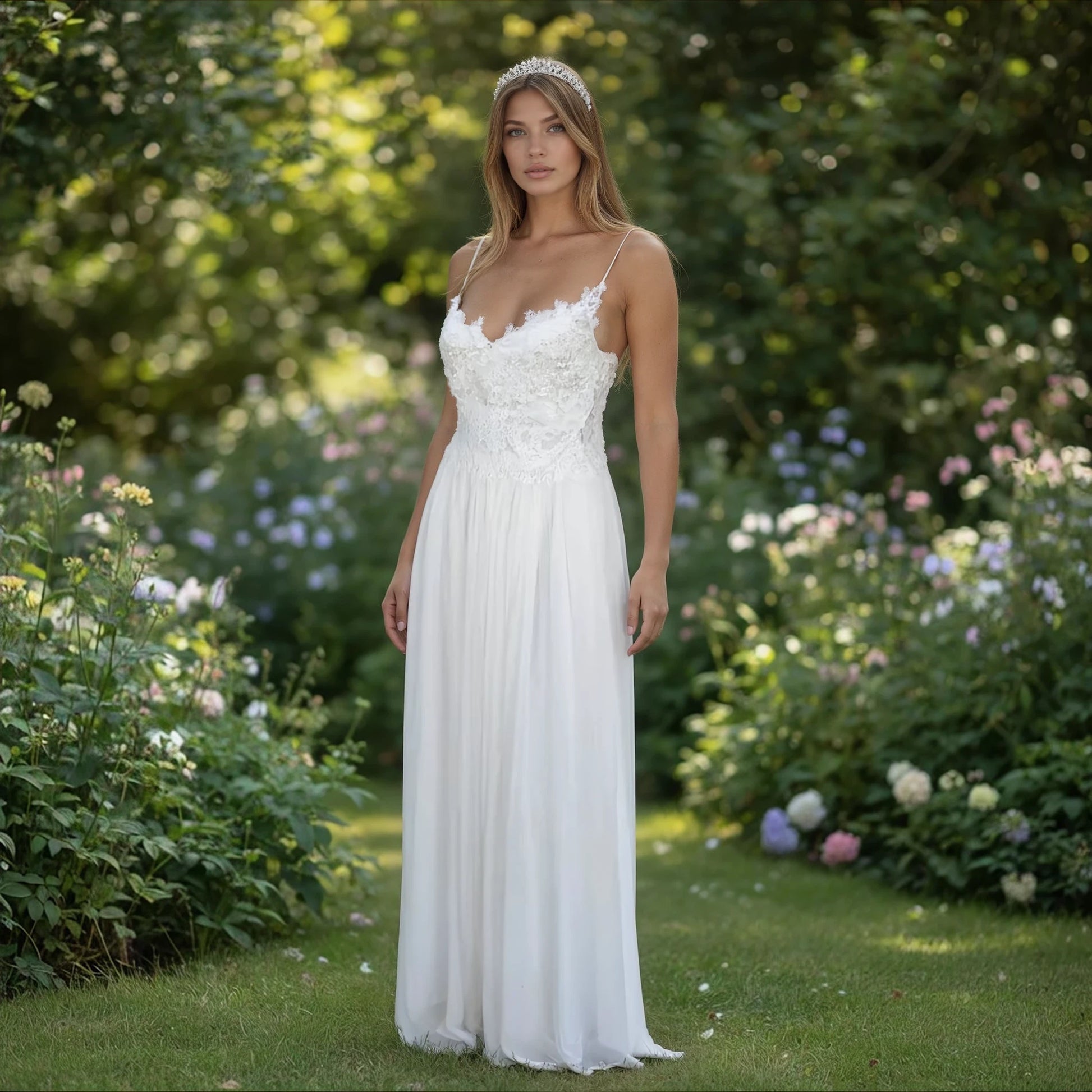 Daisy captures timeless elegance with meticulous craftsmanship. Crystal beading adorns the front yoke, flowing gracefully from straps to back, creating a luminous focal point. Delicate pearl buttons trace the back closure, adding refined detail. The sheer French lace yoke provides sophisticated transparency, while the silk chiffon skirt drapes with ethereal grace. This combination of intricate beadwork and luxurious fabrics delivers understated glamour perfect for formal occasions where refined beauty speaks volumes.